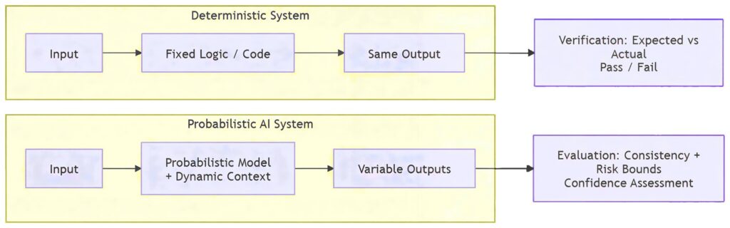 Deterministic components still require verification. Model-driven behaviour requires structured evaluation.