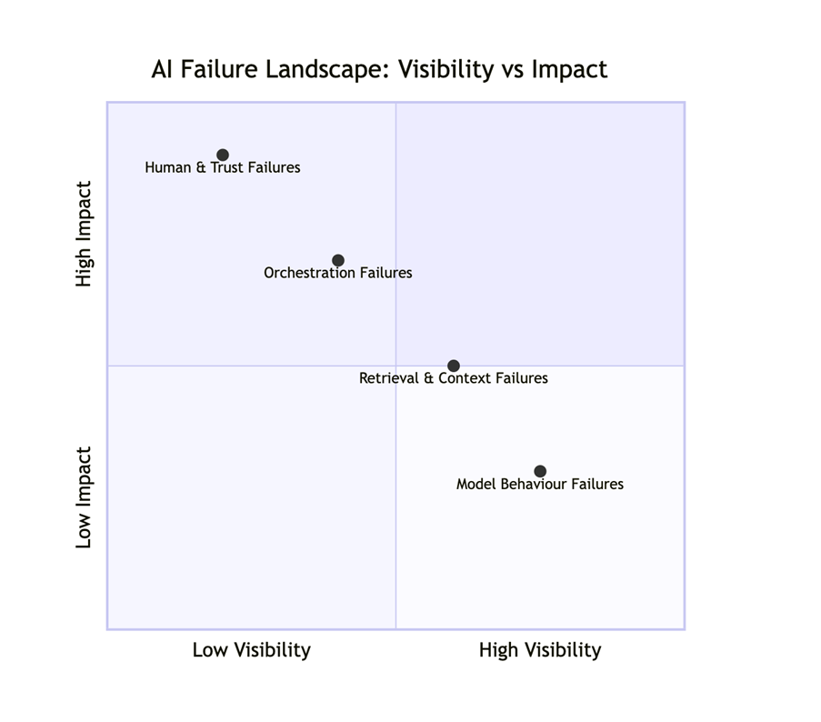 The positioning is illustrative. Actual visibility and impact will vary by architecture and organisational maturity. The principle, however, holds: The higher the layer, the harder the failure is to detect and the more consequential it tends to become.